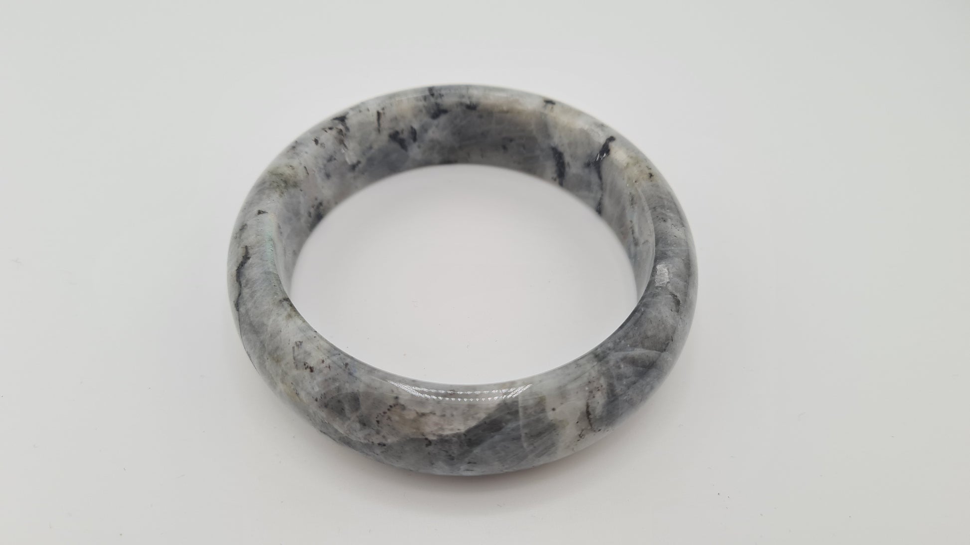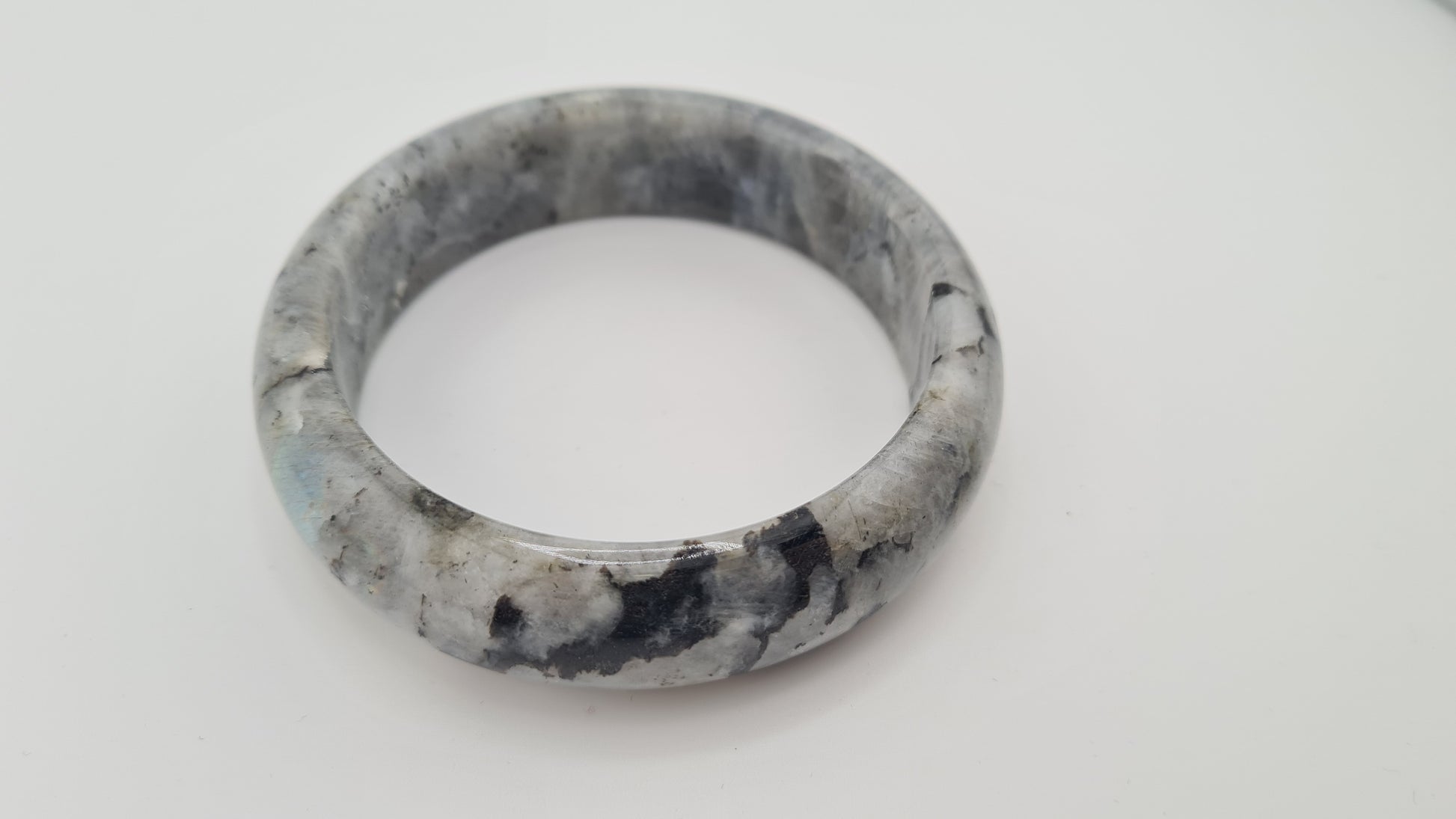 Bracelet massif en labradorite en taille unique (diamètre intérieur 70mm). Épaisseur 1cm, largeur 2cm, poids 110g.